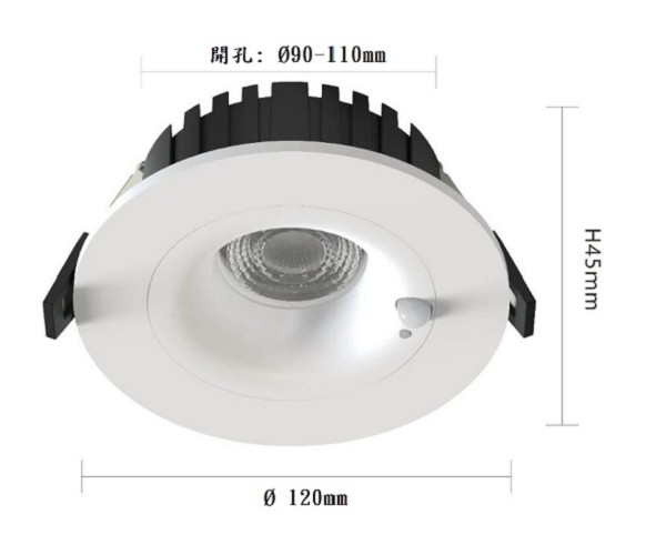 商品規格 : 開孔9公分到11公分,高度4.5公分,邊框直徑12公分,厚實鋁材,白色霧面烤漆,人體感應