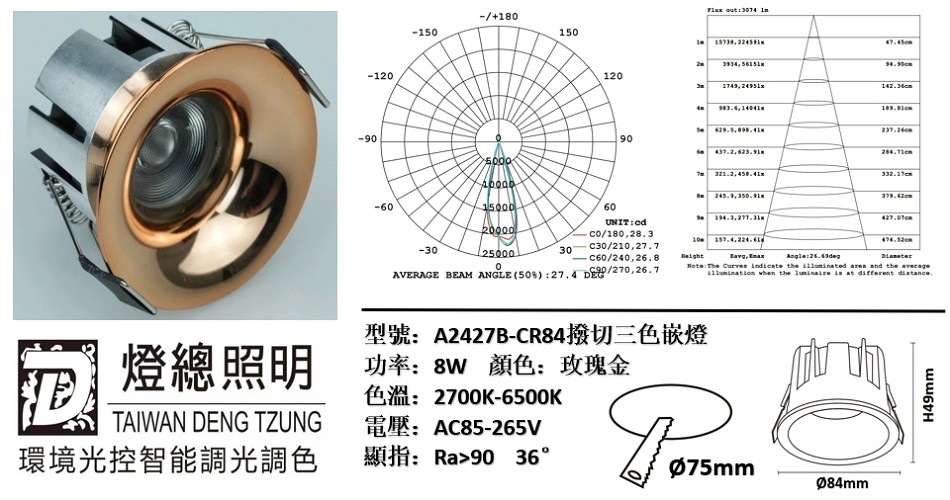 商品規格 : 7.5公分孔徑,高度4.9公分,邊框直徑8.4cm,厚實鋁材,玫瑰金烤漆,三色撥切,角度36