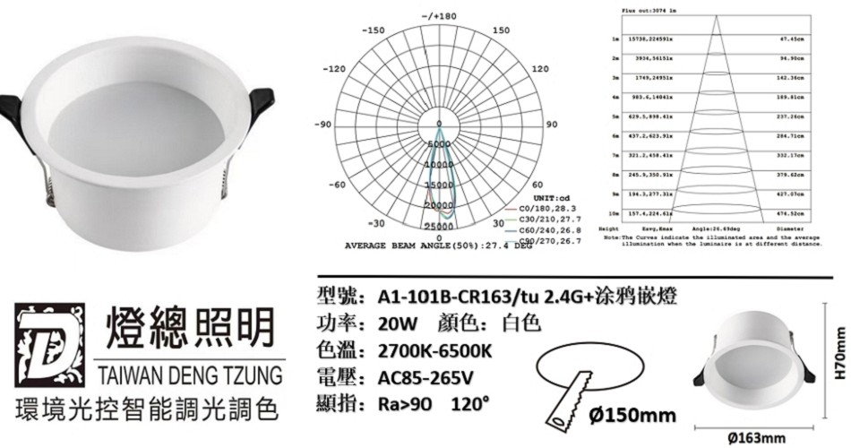 商品規格 : 15公分孔徑,高度7公分,邊框直徑16.3cm,厚實鋁材,白色霧面烤漆,角度120