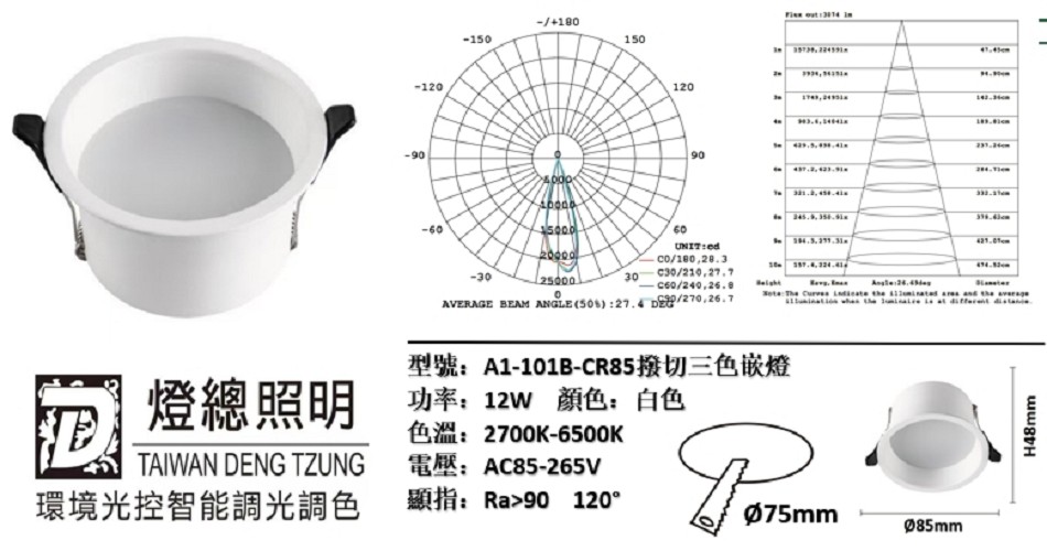 商品規格 : 7.5公分孔徑,高度8.5公分,邊框直徑4.8cm,厚實鋁材,白色霧面烤漆,角度120