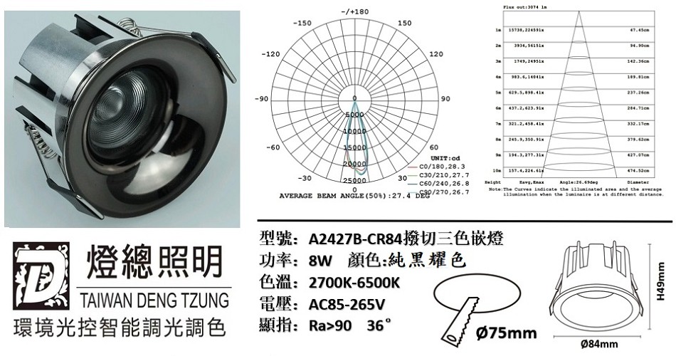 商品規格 : 7.5公分孔徑,高度4.9公分,邊框直徑8.4cm,厚實鋁材,純黑亮面烤漆,三色切換,角度36