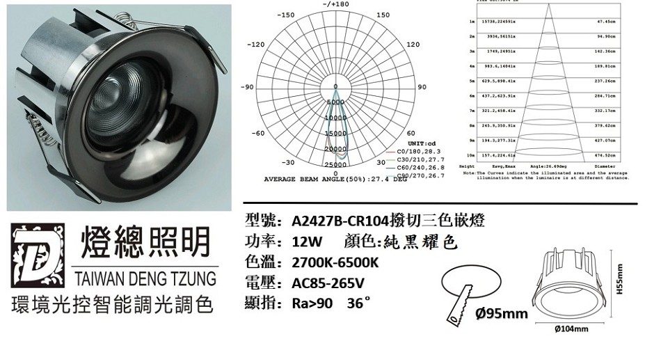 商品規格 : 9.5公分孔徑,高度5.5公分,邊框直徑10.4cm,厚實鋁材,黑色亮面烤漆,三色撥切,角度36