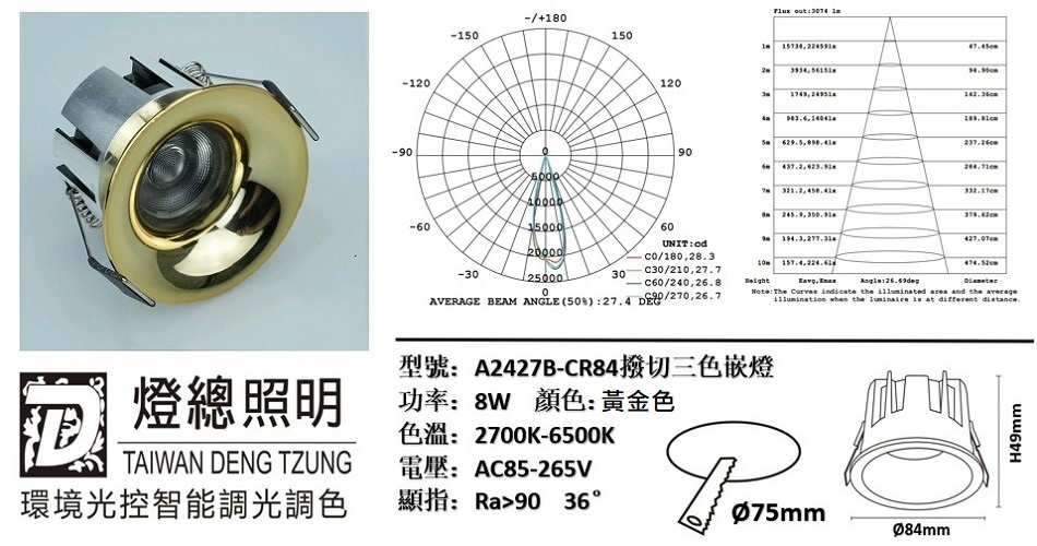 商品規格 : 7.5公分孔徑,高度4.9公分,邊框直徑8.4cm,厚實鋁材,黃金色烤漆,三色撥切,照射角度36